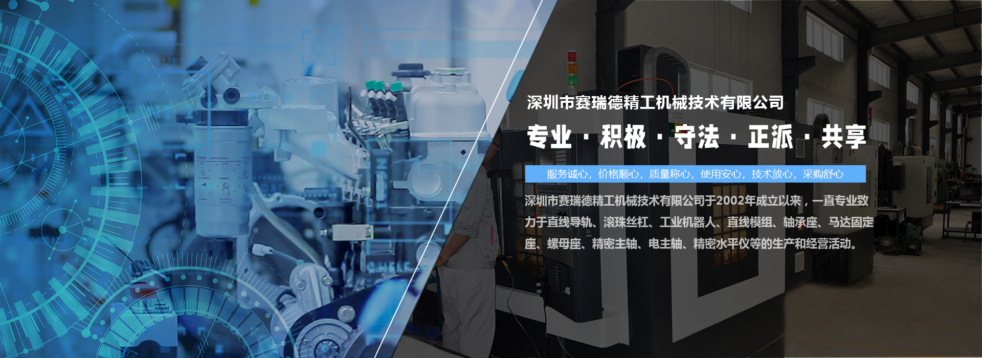 深圳市賽瑞德精工機械技術有限公司于2002年成立以來,一直專業致力于直線導軌、滾珠絲杠、工業機器人、直線模組、軸承座、馬達固定座、螺母座、精密主軸、電主軸、精密水平儀等的生產和經營活動。